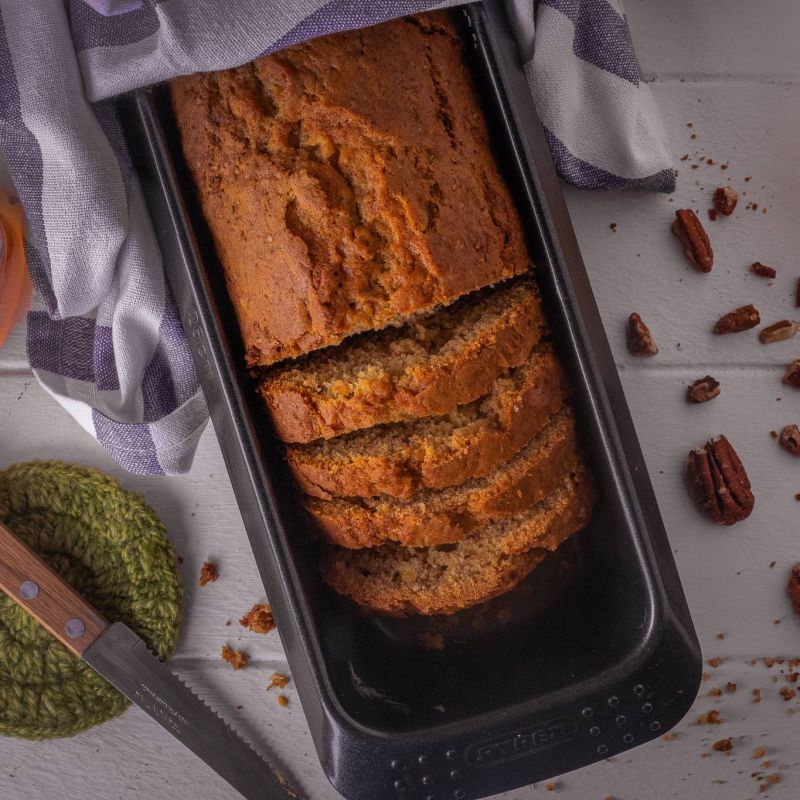 يضاف الموز المهروس والدقيق والبيكنج باودر ويخفق الخليط