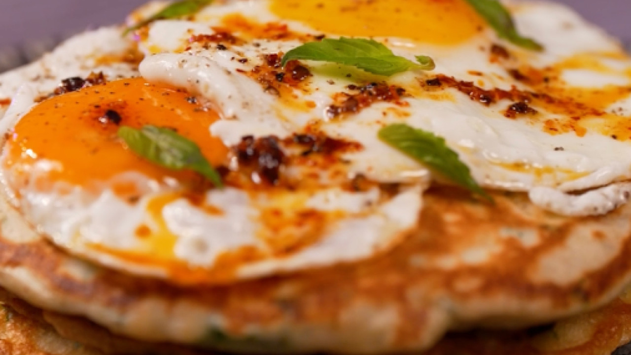 نضع على كل بان كيك بيضة صني سايد أب فوقها.