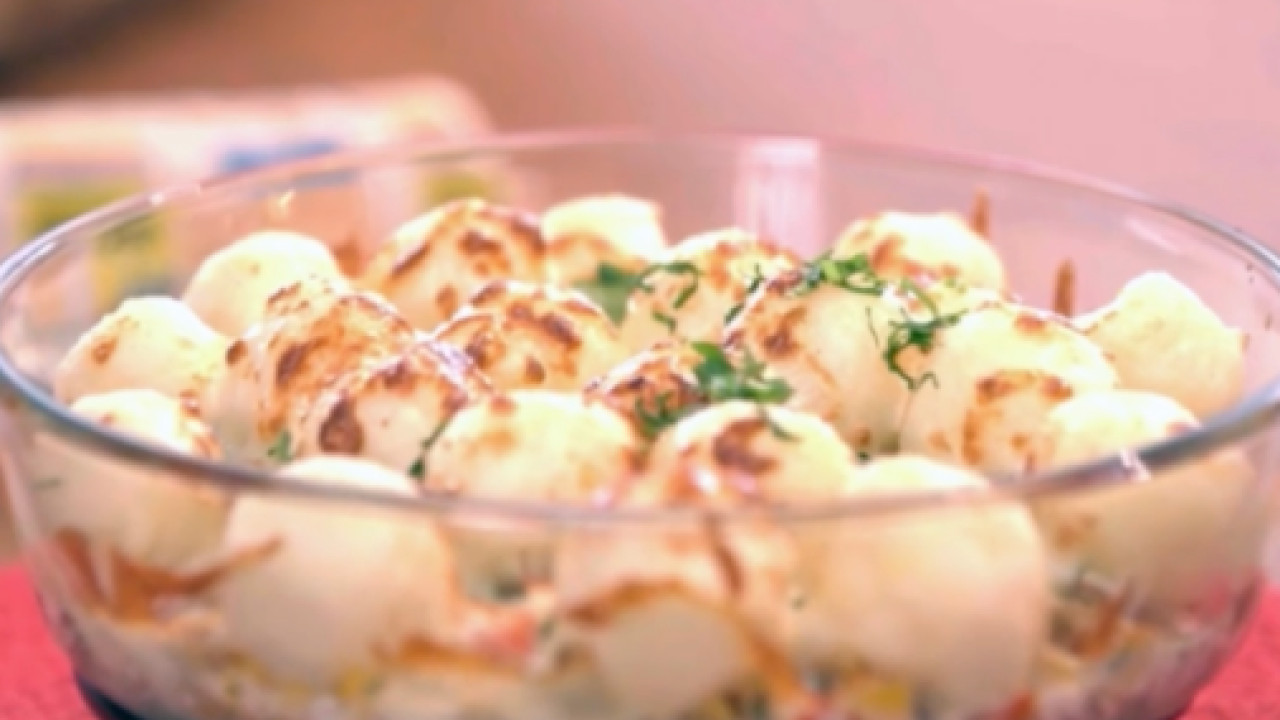 يُوضع الخليط في صينية وتُكوّر البطاطس وتُرص فوقه.