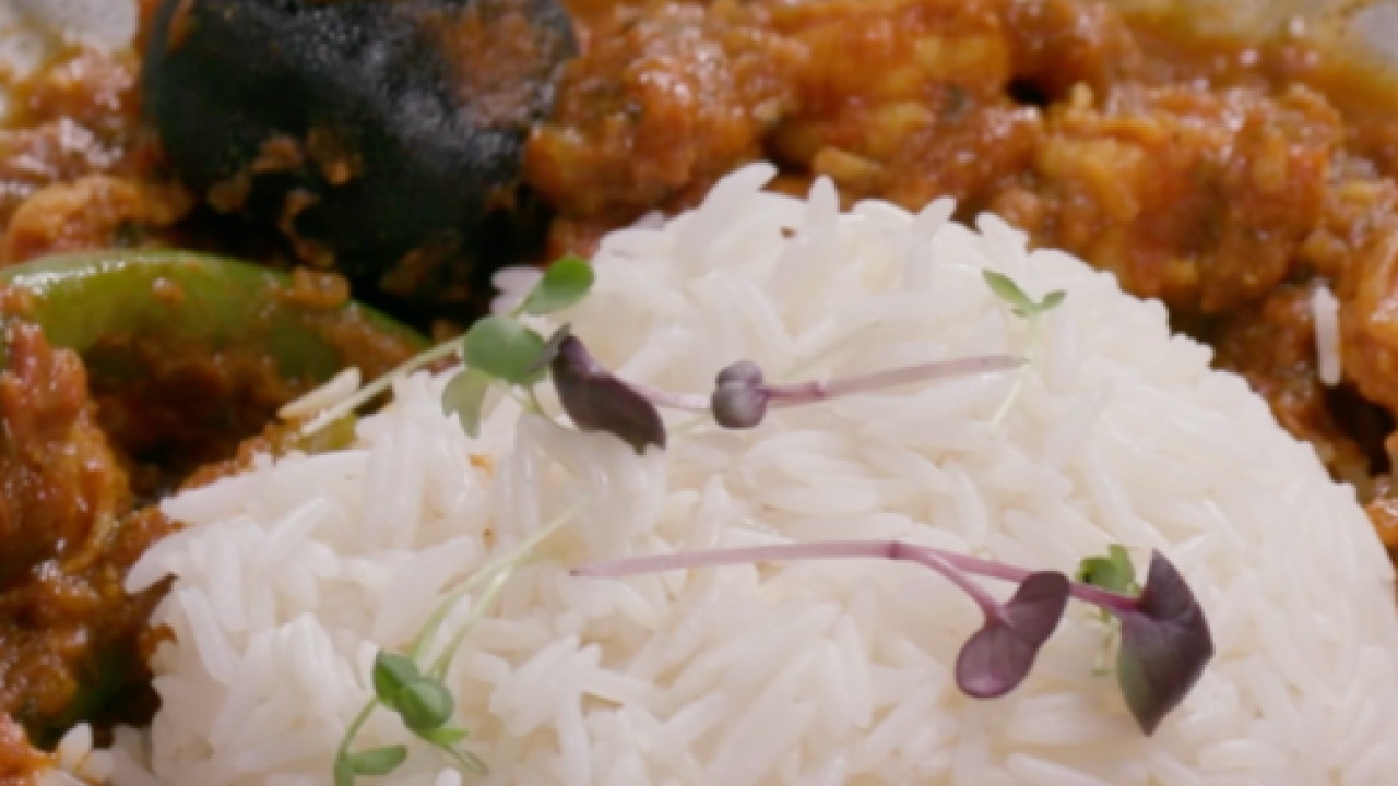 أصبحت اليخنة جاهزة للتقديم مع الأرز الأبيض.