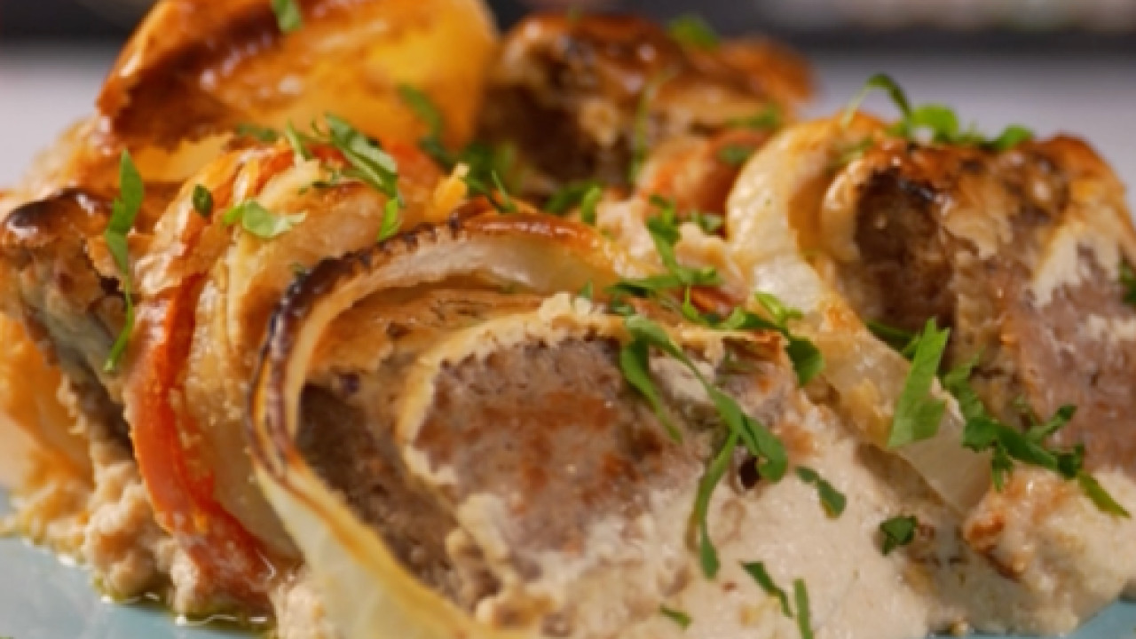 • رصي طبقات البطاطس والبصل والطماطم في صينية.