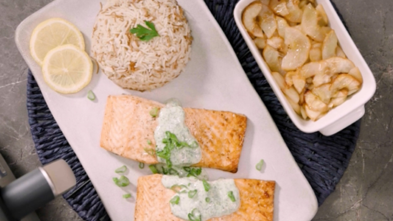 يُطهى لمدة 14–16 دقيقة حتى يصبح السلمون طريًا ويتفتت بسهولة بالشوكة.