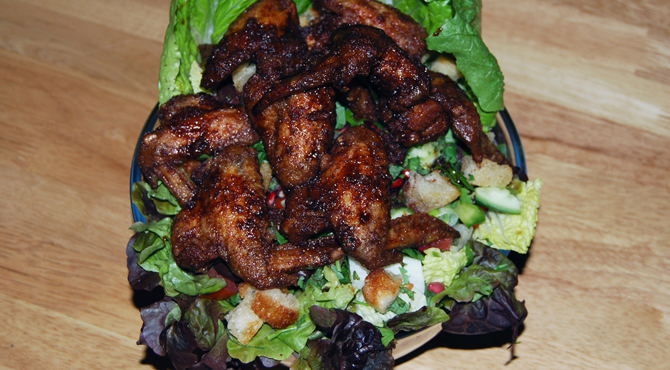 ثم توضع أجنحة الدجاج أعلى الصحن.
