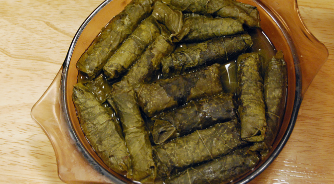 ترص أصابع ورق العنب في صحن بايريكس وتغطى بمرق السمك.