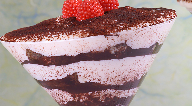 يوضع فوقها الكريمة وترش بالكاكاو ثم صف ثاني من البسكوت ثم الكريمة والكاكاو وهكذا.
