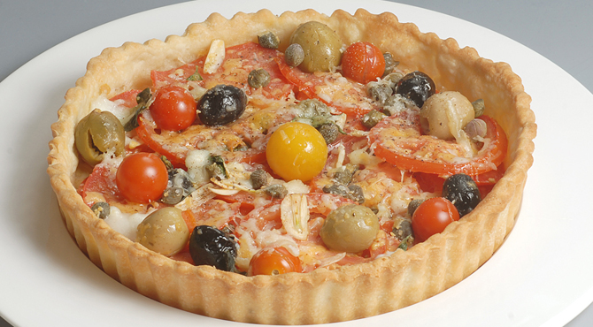تزين بشرائح الطماطم المنقوعة في زيت الزيتون والكبر، الريحان، الزيتون الخ ....