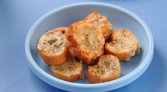 يُفرك الخبز بالثوم، ثم يُدهن بالزبدة والزيت.