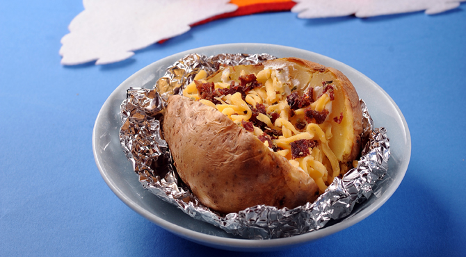 تُقطع البطاطا من المنتصف وتُحشى بالجبنة واللحم المقدد والكريمة الحامضة.