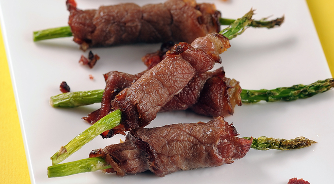 تُلف كل قطعة هليون بقطعة واحدة من اللحم المقدد، ثم يوضع مرة أخرى في الفرن من دقيقتين إلى 3 دقائق.