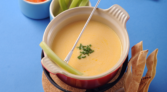 يُنقل خليط الجبنة إلى قدر فوندو. يُرش الفوندو بالثوم المعمر. يوضع القدر فوق شمعة. يُقدم الفوندو مع الخبز والخضروات.