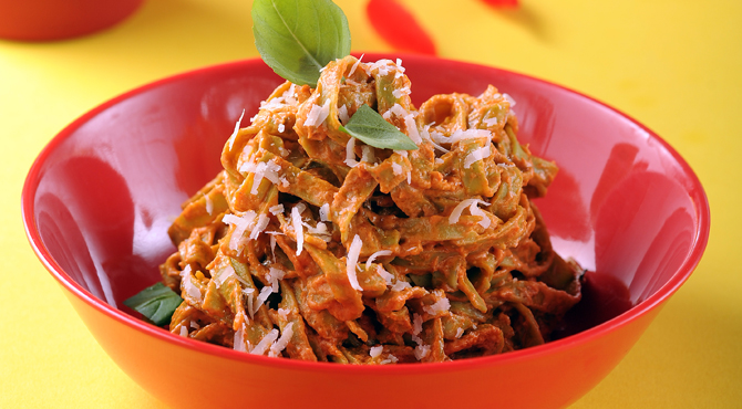 تُعاد المعكرونة إلى القدر، يُضاف خليط الكريمة ونصف كمية جبنة البارميزان ويُقلبوا ليمتزجوا. تُرش الباستا بجبنة البارميزان المتبقي وتُزين بالريحان، تُقدم مباشرة.