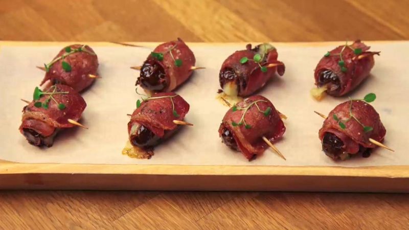 تلف كل حبة تمر بشريحة اللحم البقري المدخن وتثبت بسيخ خيزران.