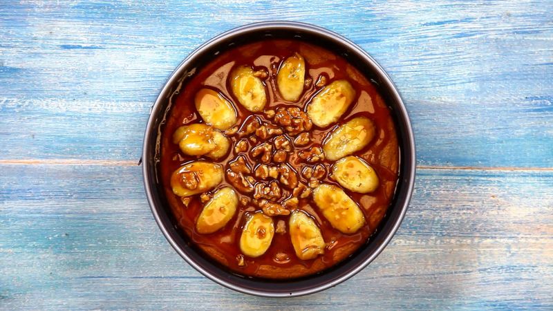 تسخن حتى تصل إلى مرحلة الغلي على نار هادئة ثم تضاف الزبدة ونحرك ببطء حتى يتكرمل المزيج، ثم يضاف الموز والجوز المفروم مع التحريك