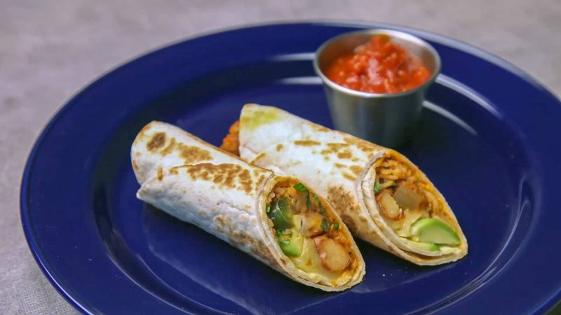 تدفئ أرغفة التورتيا لتسهيل عملية اللف، تحشى بالأرز وخليط الفول والجبنة