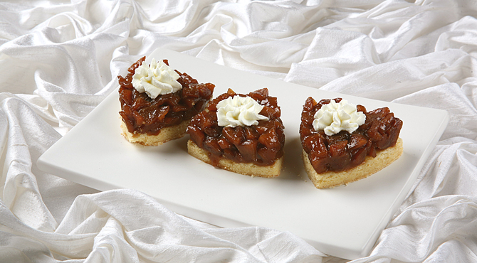 يوضع البسكويت في قالب مستدير بحجم قطر البسكويت ثم يوضع بعض الأجاص أو الكمثرى فوقه.