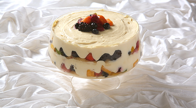 ترص طبقات من الكريمة والبسكويت والفواكه بعد تصفيتها ويعاد رص الطبقات حتى نفاذ الكمية.