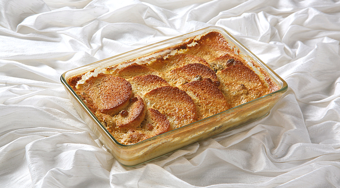 يرص التوست في صينية فرن عميقة ثم يوزع الزبيب في الصحن.
