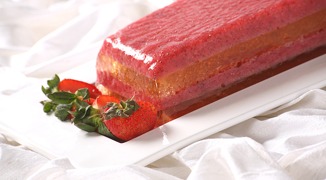 تهرس الفراولة في الخلاط وتصفى بمصفاة رفيعة للتخلص من أي بذور. يتم قياس كوبين من الفراولة المصفاة.