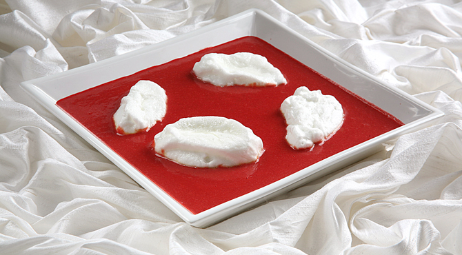تصب كريمة الشمندر في صحن تقديم عميق بعض الشئ ، ويرص المارنج فوق الكريمة.