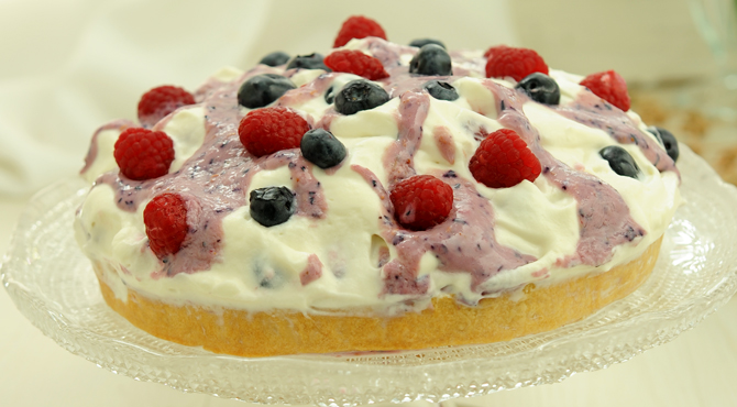 يُخلط الحليب المركز المحلى مع التوت، ثم تُضاف وتُقلب الكريمة المخفوقة، ويُغرف الخليط فوق قشرة الفطيرة