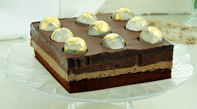 يُضاف خليط الكاكاو ويُقلب مع خليط الصفار بالتبادل مع خليط البياض والإنتهاء به .