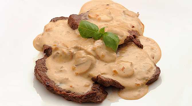 يوضع الفيليه المحمر في صحن التقديم وتُصب الصلصة على الوجه حسب الرغبة.