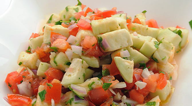يُخلط الباذنجان والطماطم والبصل والبقدونس في وعاء كبير.