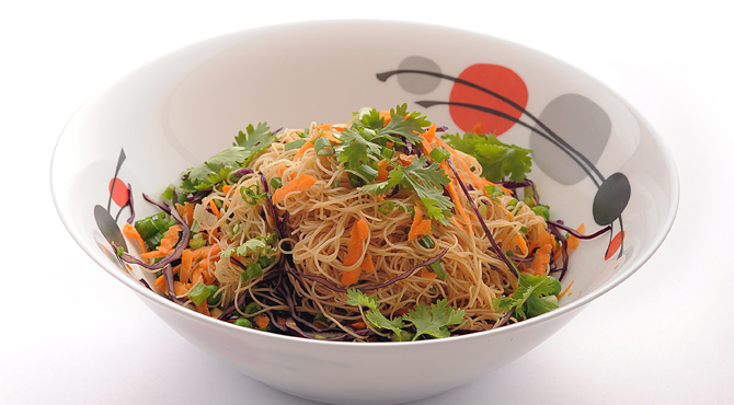 تُقدم السلطة مع أوراق الكزبرة الطازجة على الوجه.