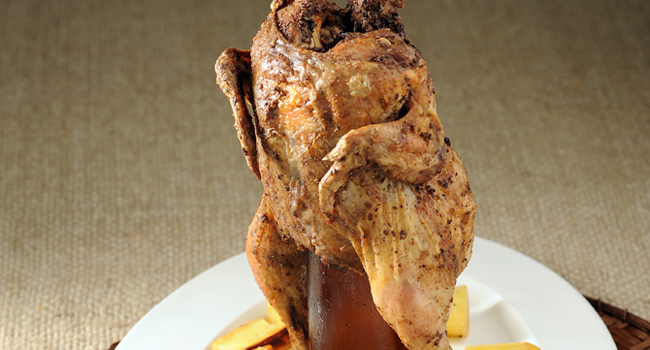 توضع الدجاجة فوق الزجاجة وتثبت جيدا ويثبت الأجنحة فوق الصدر بعود خشب