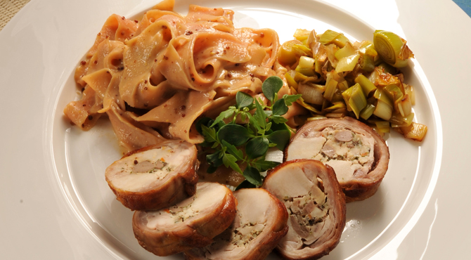 يستخدم حوالي 2 كوب من لحم الأرانب للحشو، حيث يقطع ناعمًا ويخلط مع الكريمة فوق وعاء به ثلج حتى يتجانس الخليط، ثم يضاف البقدونس ويخلط جيدًا، وبعدها يوضع الخليط في الثلاجة.