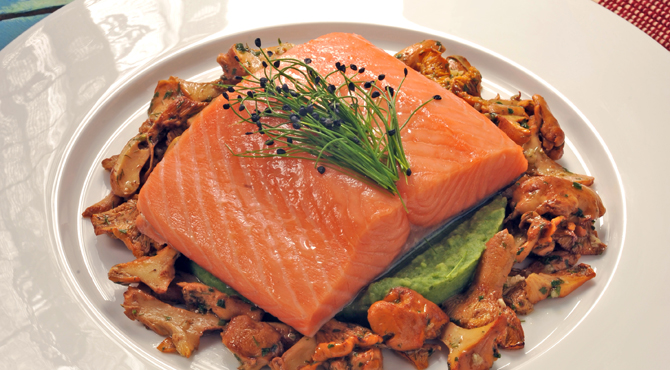 يسخن زيت الزيتون في مقلاة ويشوح فيه الفطر إلى أن يكرمل.