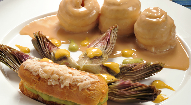 يرش الأرضي شوكي بالملح ويقدم مع مايونيز الأنشوجة.
