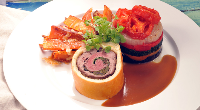 ترص الخضروات بأسلوب جمالي لعمل ما يشبه قالب الكعكة باستخدام قالب تقطيع الكوكيز.