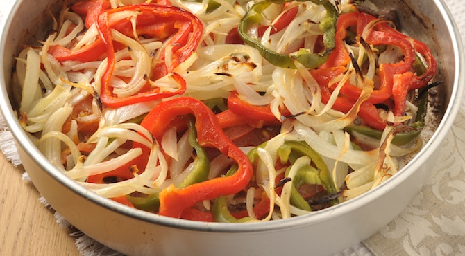 في وعاء آخر توضع شرائح البصل يضاف الفلفل الرومي الأحمر والأخضر , ثم الملح و الفلفل و أخيرا زيت الذرة .