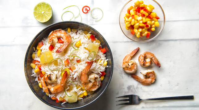 تضاف قطع الأناناس، البصل الأخضر، الفلفل الرومي، الزبيب والذرة الى الأرز.