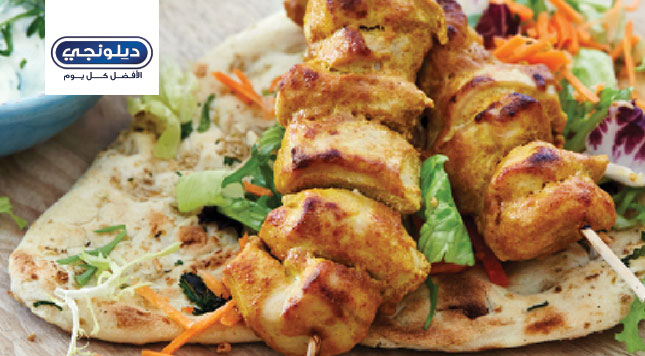 يٌقدّم دجاج تكا مع الخبز وصلصة الزبادي (حسب الرغبة)