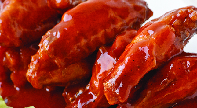 تغمس أجنحة الدجاج في الصوص حتى يغلفها جيداً .