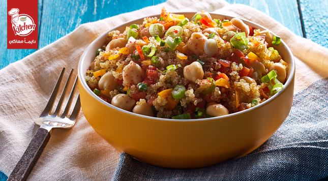 تخلط جميع مكونات السلطة مع الكينوا و ½ عبوة الحمص، ثم يضاف صوص السلطة، وييقلب جيداً، ويزين بالمتبقي من الحمص, ثم يقدم.