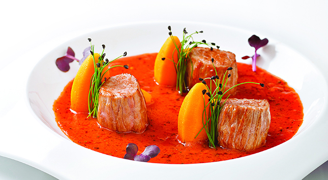 في قدر تذاب 2 ملعقة من الزبدة، ثم يضاف اللحم ويُقلب حتى يتحمر، وبعدها يضاف الماء ويغلى وتزال الزفرة من على الوجه. تضاف الباقة والخضروات العطرية ويطهى الخليط على نار هادئة، مع وضع الغطاء، لمدة ساعة ونصف أو حتى ينضج اللحم.