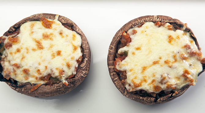 يخرج فطر البورتوبيلو من الفرن وتوزع فوقة صلصة الطماطم.