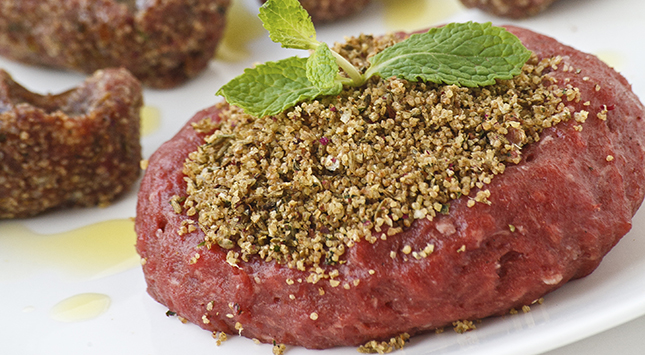 في محضرة الطعام يُقطع البصل والنعناع والريحان والشطة الحمراء والورد المجفف والبرغل.