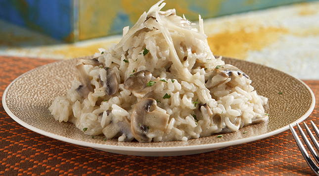 بعد 5 دقائق من رفع الثوم من القدر، يضاف الفطر ويُطهى على نار منخفضة الحرارة مع التقليب المستمر، ويضاف الحليب للحفاظ على طراوة الفطر، ثم يضاف الأرز والكريمة ويُقلبا.